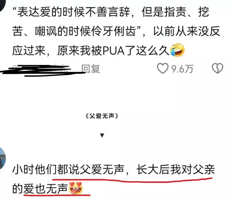 有网友调侃:小时候他们总说父爱无声,长大之后我对父亲的爱也无声,这有什么问题吗?更有网友直接挑破了“父爱无声”的窗户纸:表达爱的时候不善言辞,但是指责、挖苦、嘲讽的时候却是伶牙俐齿,小时候不懂,长大了才反应过来,原来自己被所谓的父爱PUA了那么久。